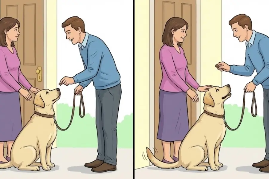 – Start Without Guests: Practice in a calm environment. Walk towards your dog. If they jump, immediately turn your back, cross your arms, and look at the ceiling (like the man in the first image). Become a statue.